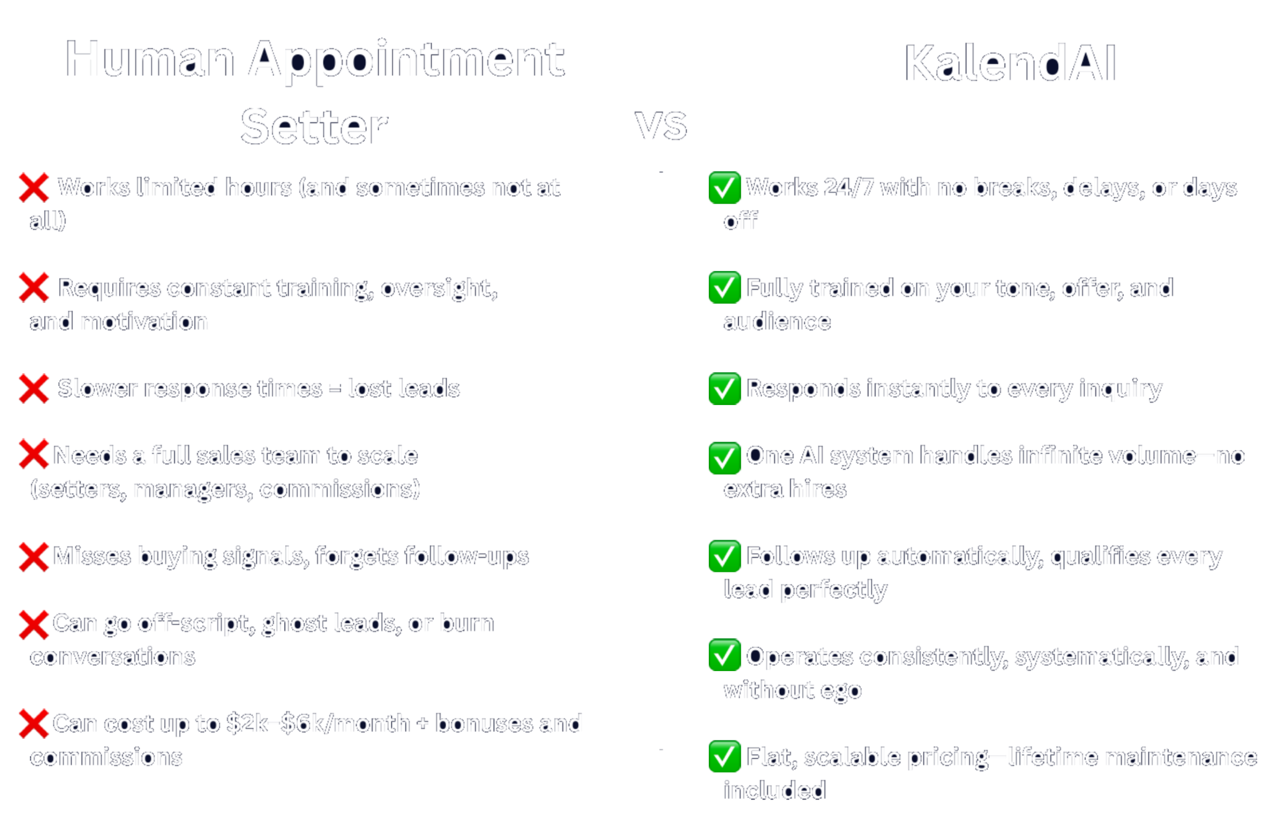 KalendAI was built for one reason — to fix the broken process of booking sales calls.As coaches, consultants, and agency owners, we rely on booked calls to grow. But the old way of doing it — chasing leads, hiring inconsistent setters, manually following up — is slow, stressful, and impossible to scale.We created KalendAI to solve that.It’s not another chatbot. It’s not another CRM.